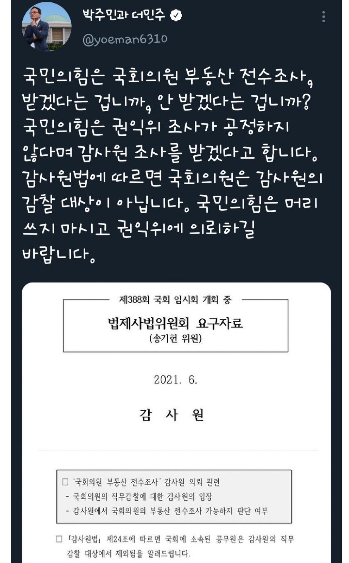 오 찾아보니 심지어 감사원은 조사 불가하니 못함이라는 의견을 냄.
