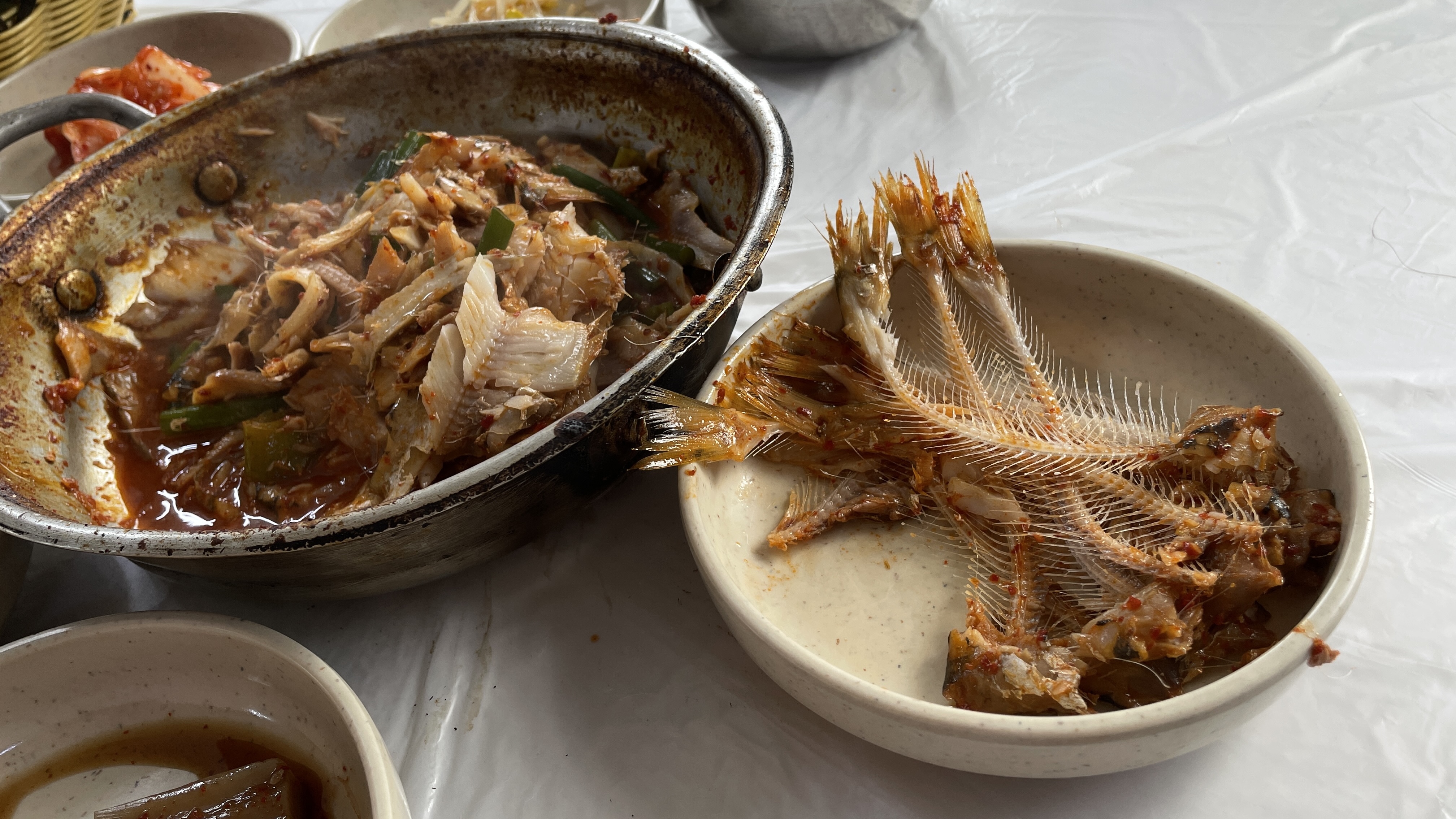 와서 빈뎅이 머리 끄댕이를 잡아 채서 뼈를 발라내 주신다. 통 뼈들은 빠져나가지만 잔뼈들은 남아있어서, 쌈으로 먹지 않으면 확실히 뼈가 거슬리긴 한다.